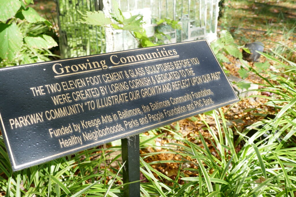 The location of our meeting, the Sculpture Garden, features two glass sculptures completed by local artist and resident Loring Cornish. In addition to this exhibit, which has been on display for over a decade, Loring has countless other sculptures featured in the American Visionary Art Museum, the Reginald F. Lewis Museum, the Smithsonian American Art Museum, and more.