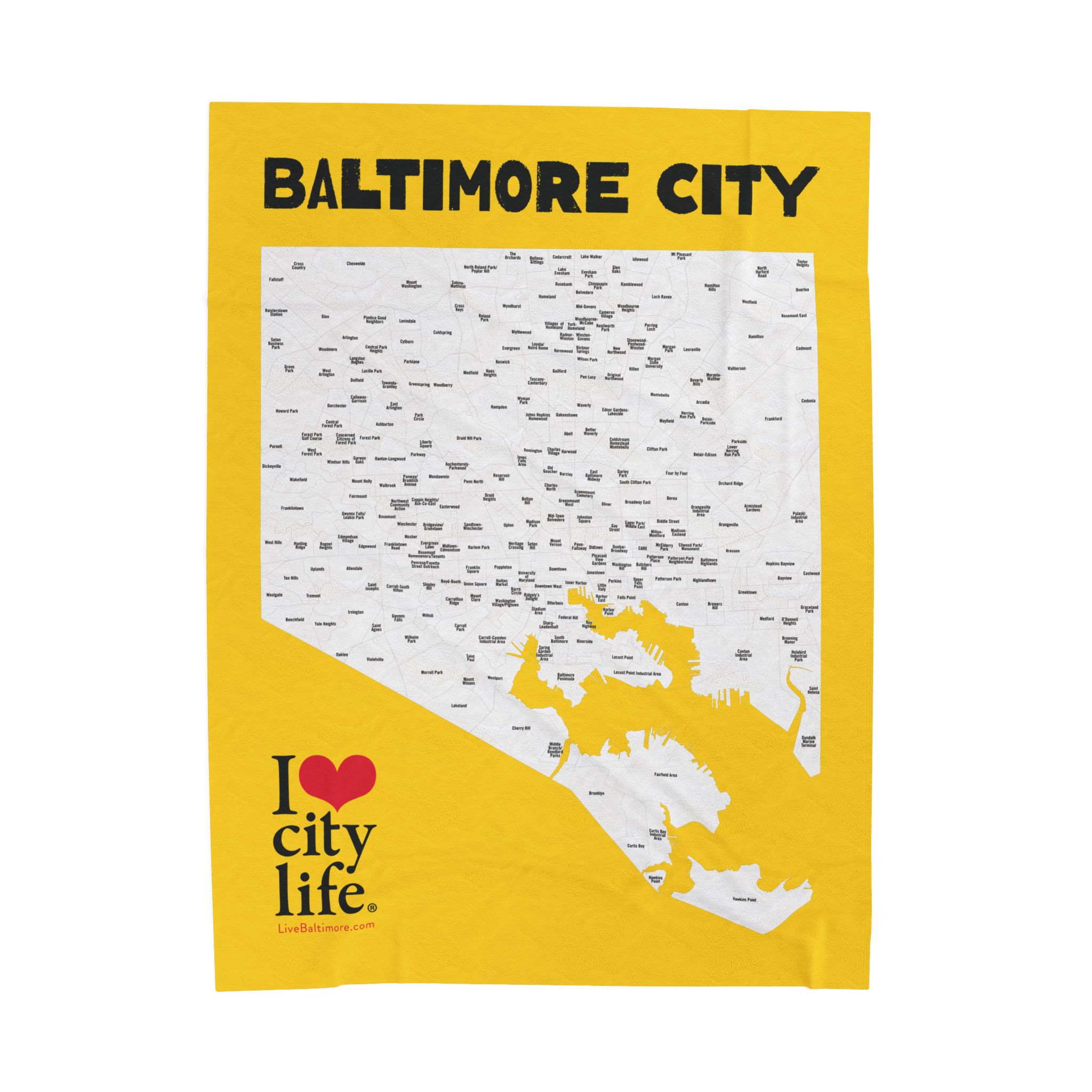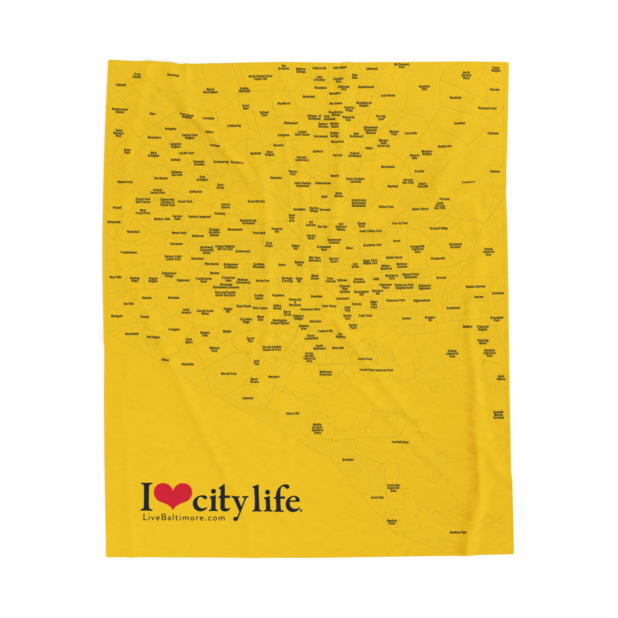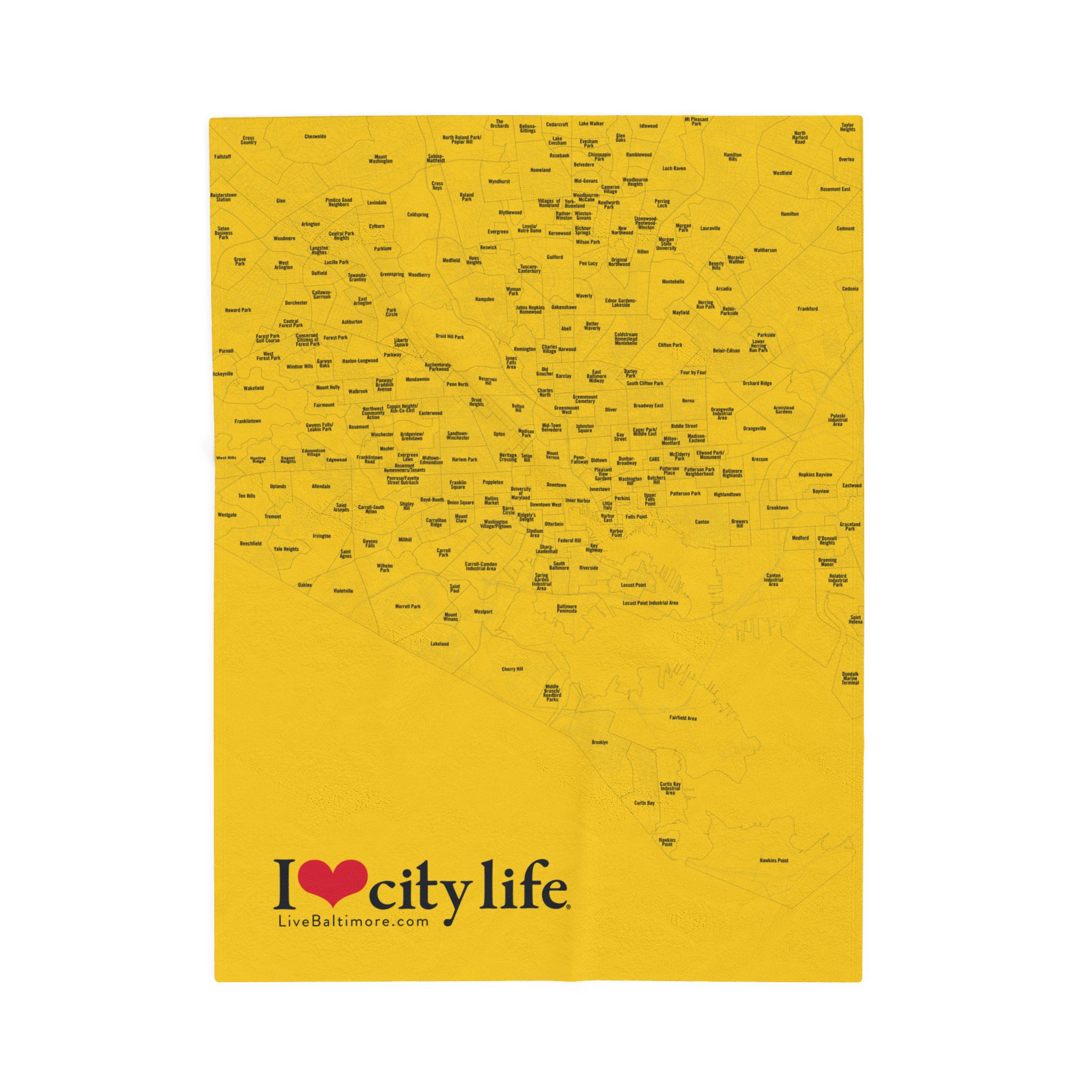 A velveteen plush blanket featuring a full map of all 279 neighborhoods in Baltimore City. This cozy and durable blanket comes in three different sizes and is perfect for adults looking to showcase their love for their city. Ideal for holiday gifts, housewarming presents, or as a unique home decor item.