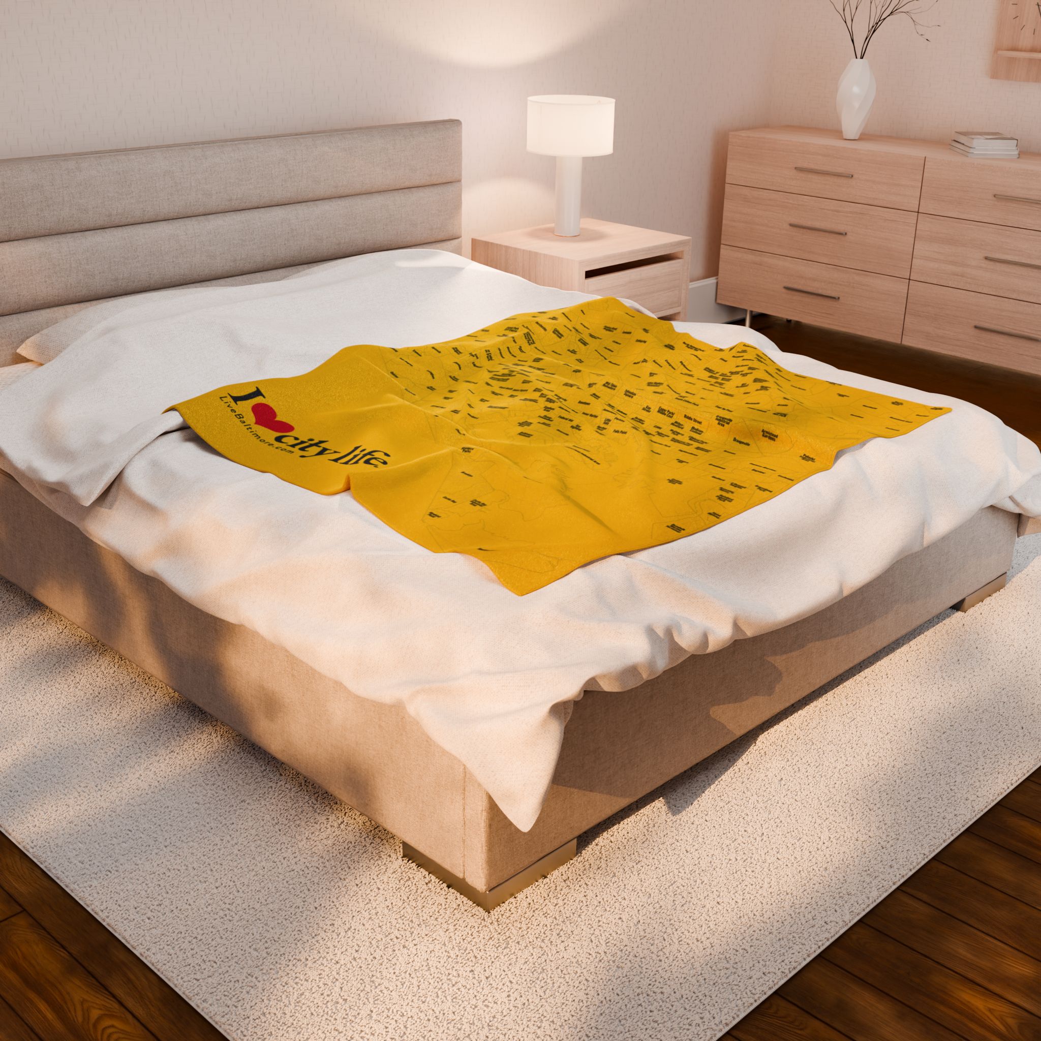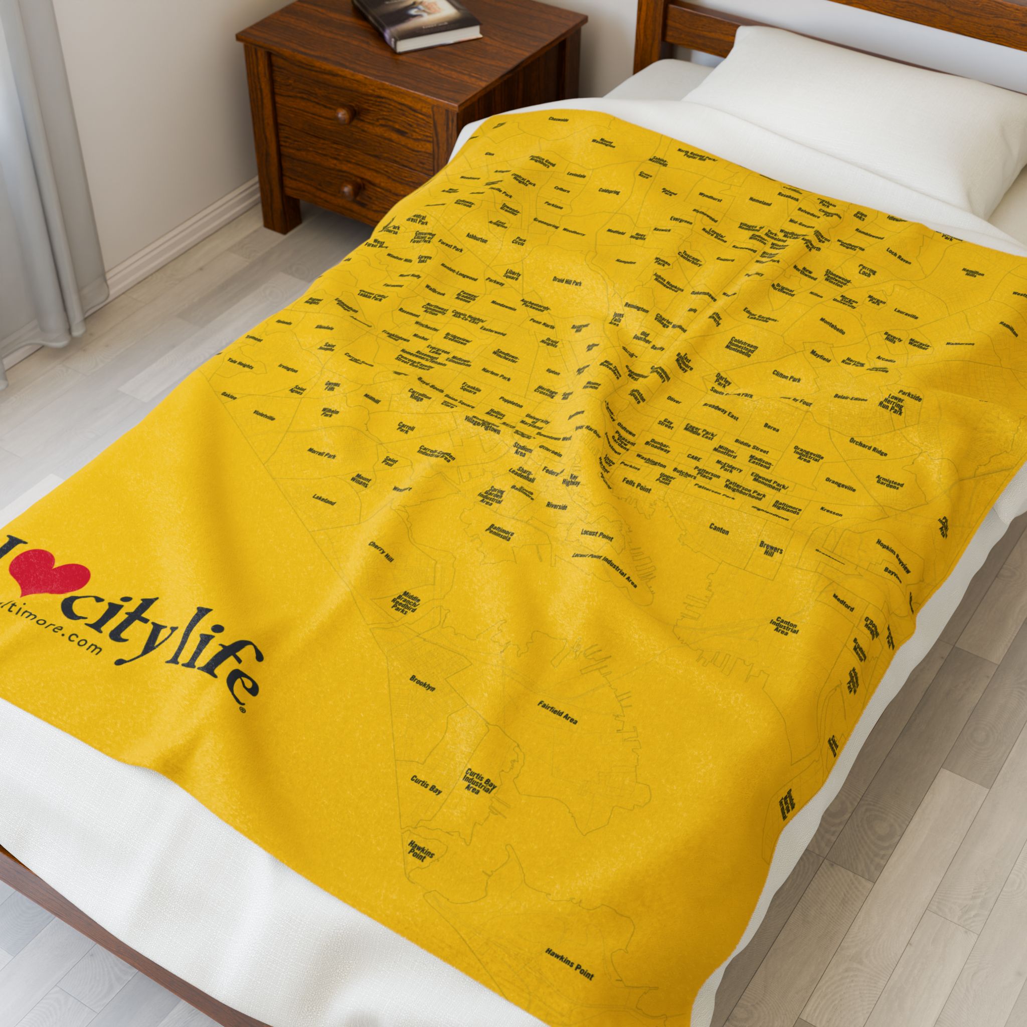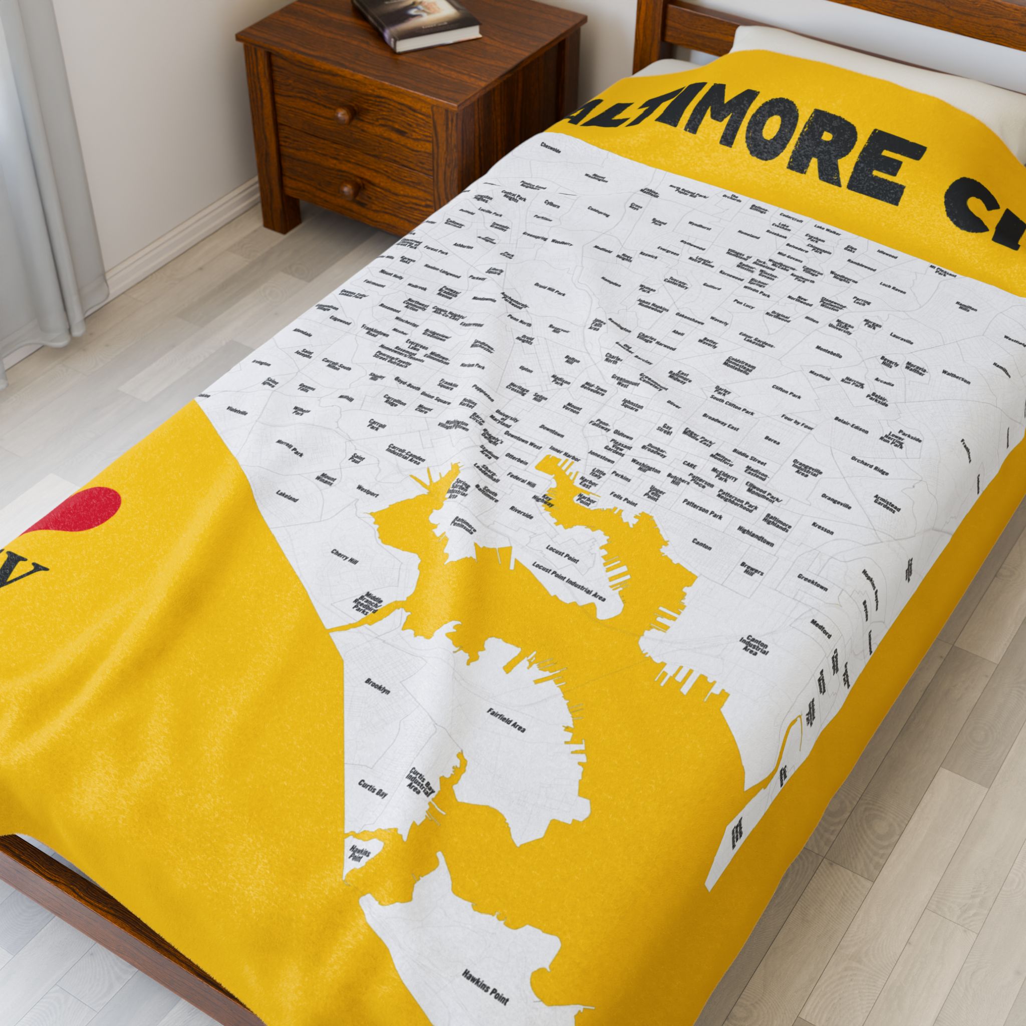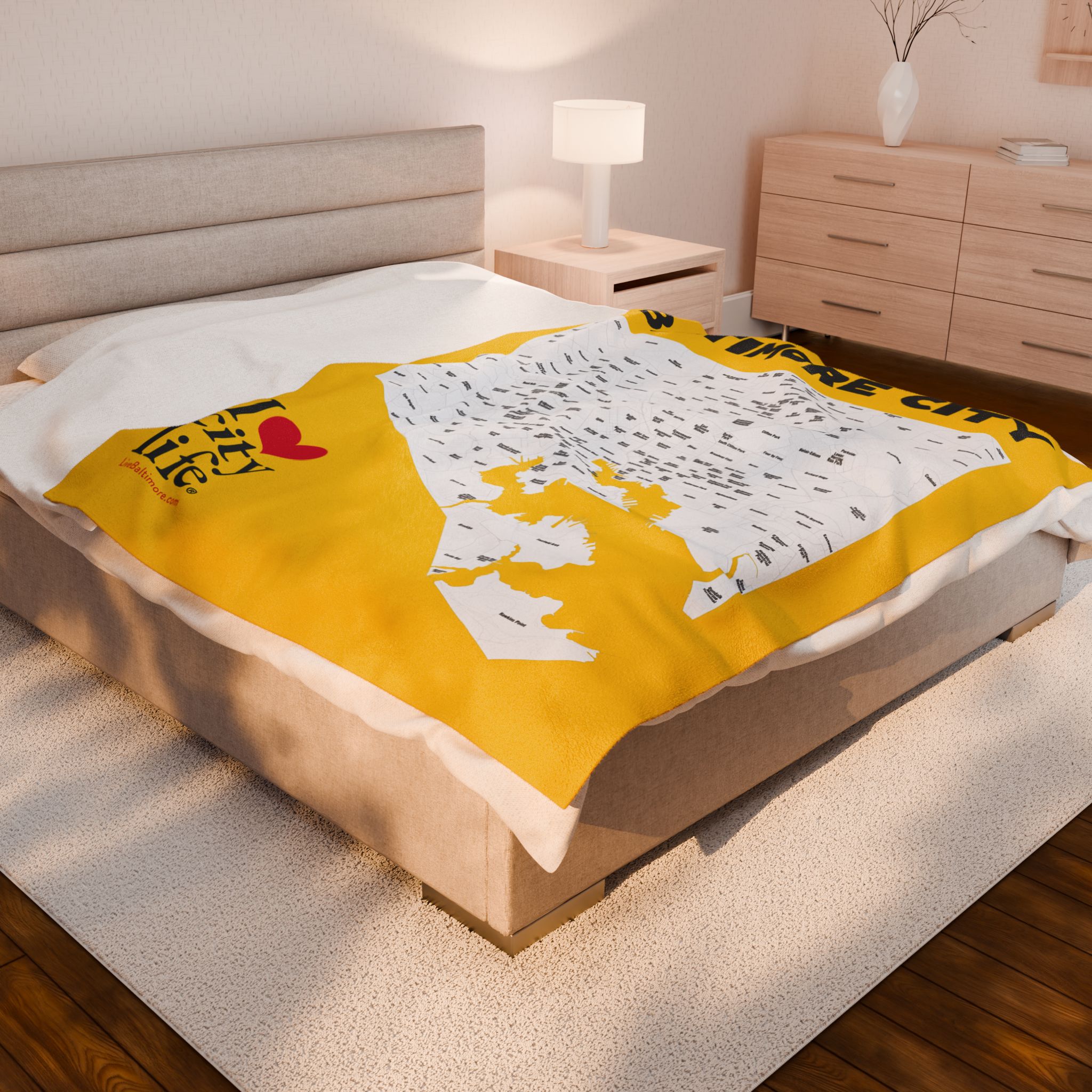 A velveteen plush blanket featuring a full map of all 279 neighborhoods in Baltimore City. This cozy and durable blanket comes in three different sizes and is perfect for adults looking to showcase their love for their city. Ideal for holiday gifts, housewarming presents, or as a unique home decor item.